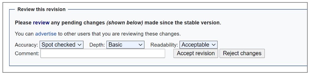 - IMPORTANT NOTE: You can only accept or reject all the new revisions that were saved together at once (cannot accept some and reject some) – if only some changes are desired, the Associate Editor will need to reject the revision and then manually re-edit the page to add in the new wanted changes or accept all the changes and manually remove the new ones that are not desired.