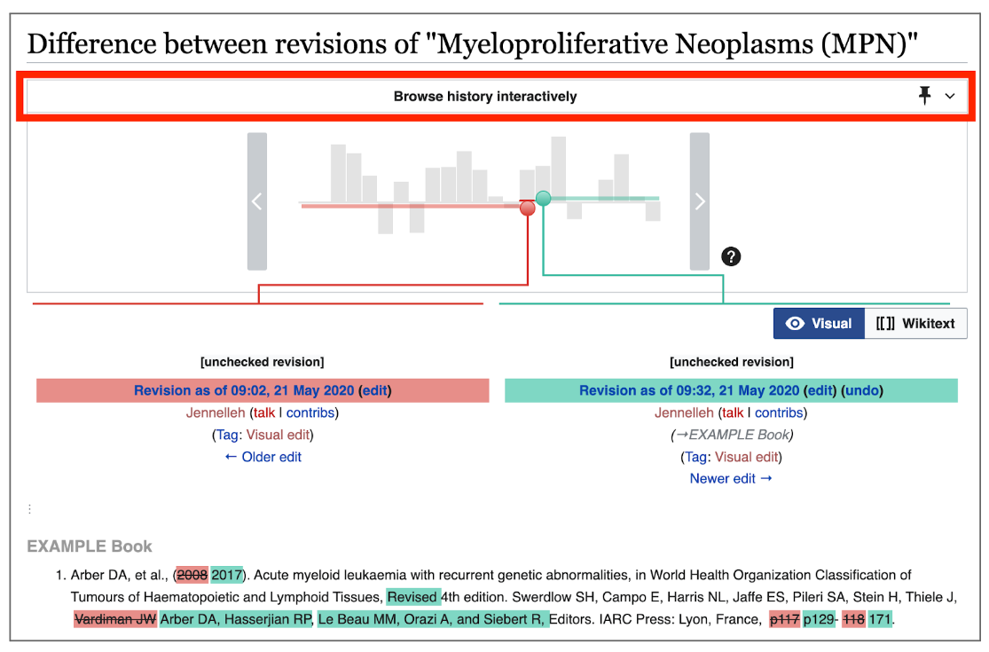 Extra functionality if of interest - Browsing history interactively (see image below): Each revision represents a single "save" by an author/editor. There may be multiple revisions to review, and each revision may have multiple changes within it. A visual representation of the changes can be used to select and approve a subset of the changes. However, for any revision to be accepted, all previous revisions must also be accepted. To visualize the changes, click on the “Browse history interactively” bar on the top and compare different versions:
