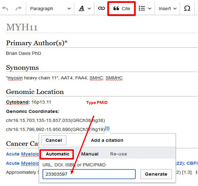 We recommend using the Microsoft Word template and saving a draft of your page before transferring the completed content to the site (suggest denoting references as PMIDs in the Word document; see below for inserting references in the CCGA site). The Word templates also have helpful additional instructions. The Associate Editor will add your name to the top of the page so that others know it’s in progress.