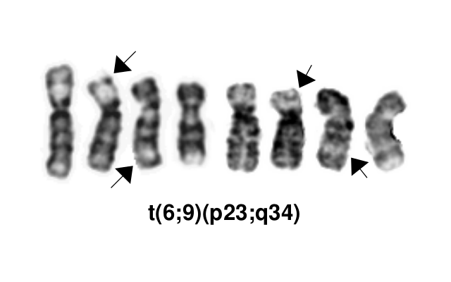 - ↑ Slovak, M. L.; et al. (2006). "A retrospective study of 69 patients with t(6;9)(p23;q34) AML emphasizes the need for a prospective, multicenter initiative for rare 'poor prognosis' myeloid malignancies". Leukemia. 20 (7): 1295–1297. doi:10.1038/sj.leu.2404233. ISSN 0887-6924. PMID 16628187.