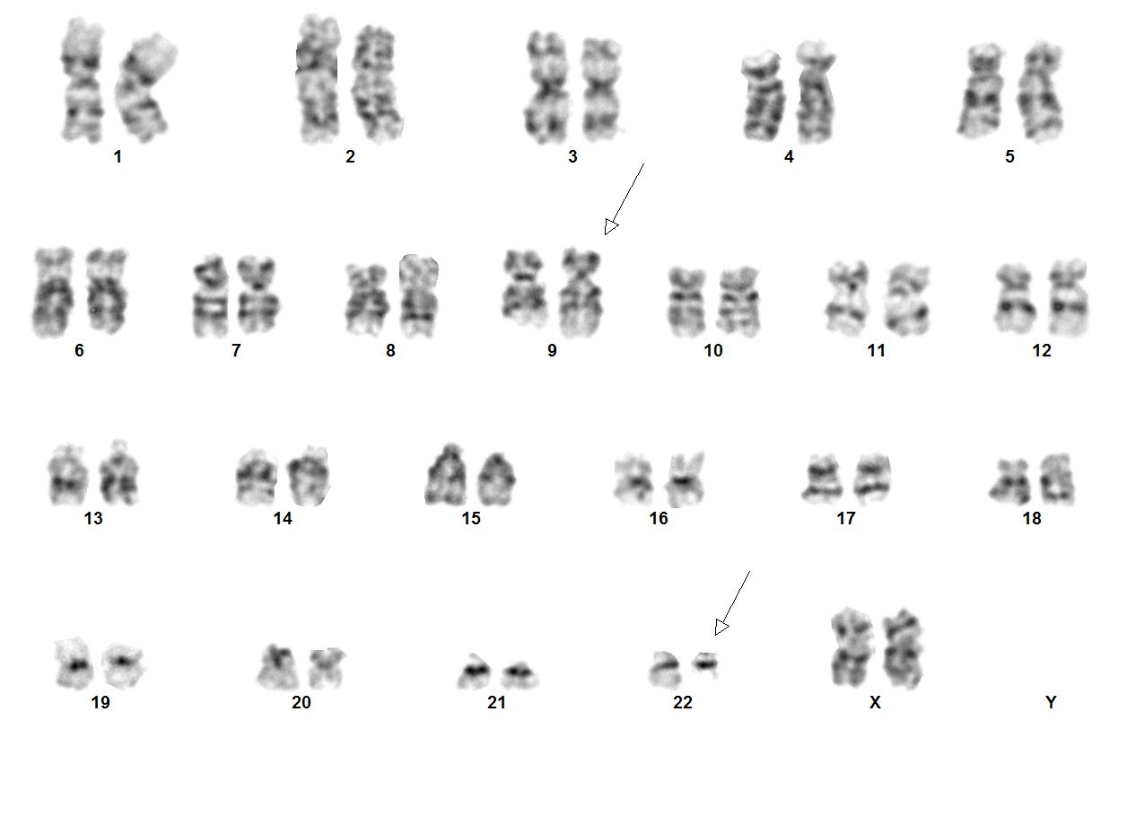 CML is the first cancer that is known to be linked to a specific genetic abnormality, namely the balanced chromosomal translocation known as Philadelphia Chromosome. A focal gene area of BCR (Breakpoint Cluster Region) from chromosome 22 is fused with another gene ABL (Tyrosine protein kinase ABL) that is located on chromosome 9. The chimeric oncogene BCR-ABL is the central to the pathology of CML because ABL carries a domain that is capable of phosphorylating tyrosine residues, activating a cascade of proteins that control the cell cycle. It was reported that 90% - 95% of the CML in chronic phase shows characteristic t(9;22)(q34;q11.2) reciprocal translocation that results in the Ph chromosome. This balanced translocation leads to the formation of the BCR/ABL fusion gene on chromosome 22 and a reciprocal ABL/BCR fusion gene on chromosome 9. Studies has shown that the latter gene ABL/BCR fusion gene does not seem to have any crucial role in CML and no ABL/BCR protein has been found.