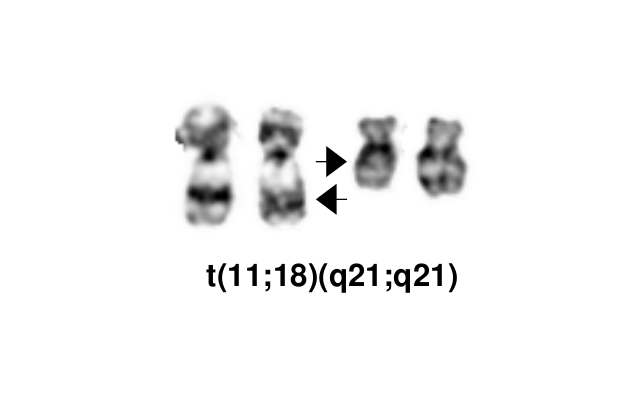 | t(11;18)(q21;q21) | 5'BIRC3 (API2)-3'MALT1 | NF-κB | 15-40% | Stomach, lung, ocular adnexa | Associated with resistance to H. pylori eradication therapy |
