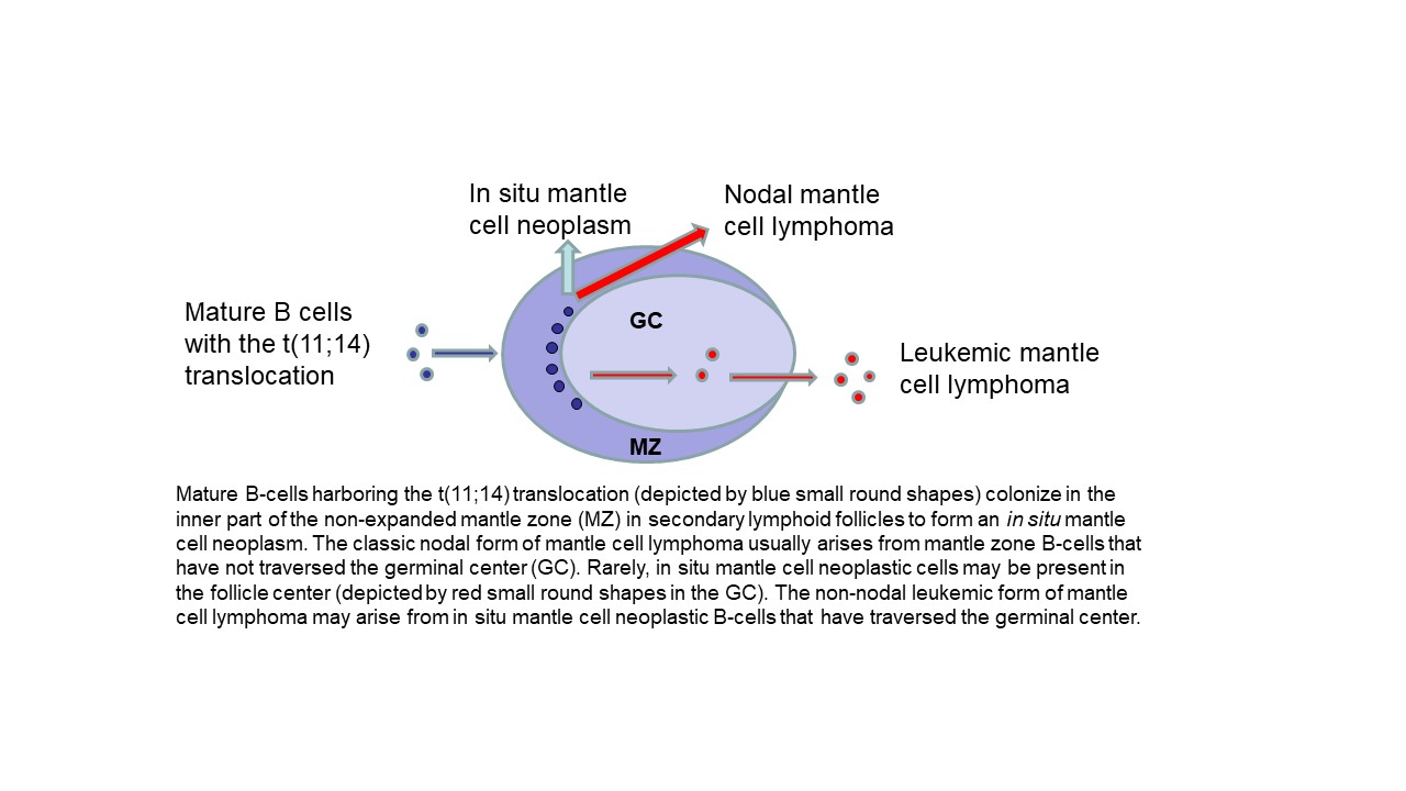 In those individuals without an overt lymphoma, in situ mantle cell neoplasm is often considered to be, or might be similar to being a tissue counterpart of rare circulating t(11:14) positive lymphocytes in peripheral blood. While overt mantle cell lymphoma involves dysregulated cell cycle and DNA damage response pathways, the steps of the development of an overt mantle cell lymphoma from an in situ mantle cell neoplasm are not yet understood.