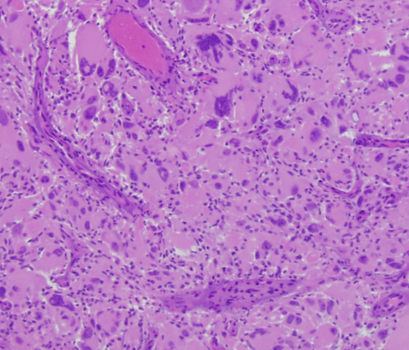 Hematoxylin and Eosin stained section of giant cell glioblastoma showing bizarre multinucleate cells